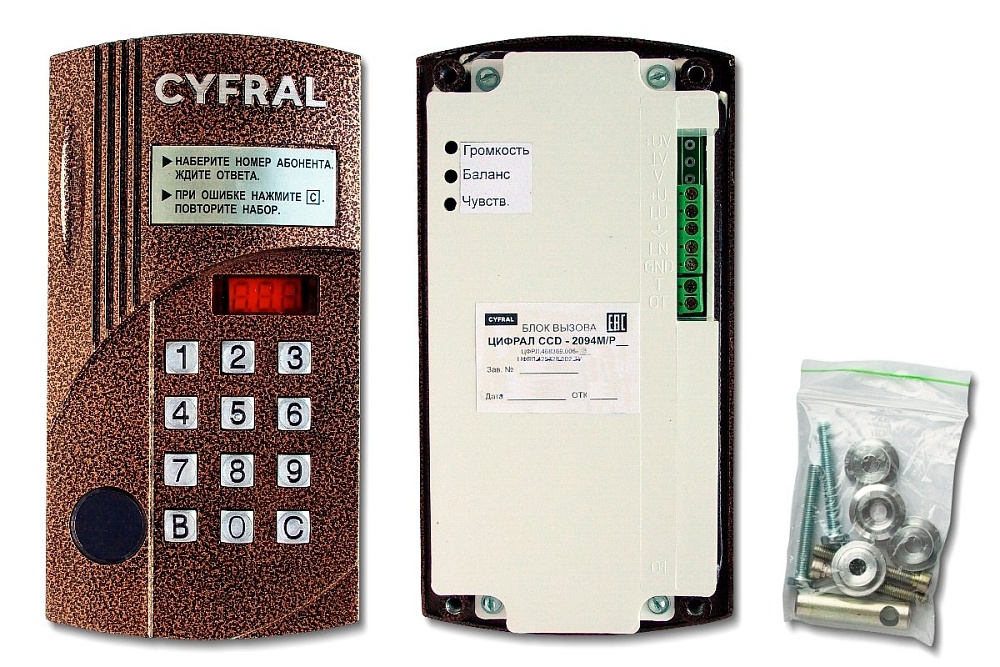 Врезная вызывная панель координатного аудиодомофона; до 100 абонентов (с коммутатором КМГ-100М); встроенный считыватель RFID-ключей Цифрал КП-1( RF-1); подсветка клавиатуры; -40...+50°С