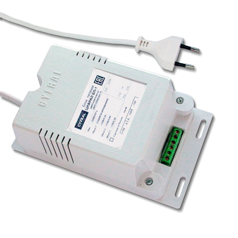 Выходные напряжения =12 В/0,6 А; =15 В/0,6 А; ~15 В/0,3 А; предохранитель в каждой цепи; входное напряжение ~220В/50Гц; пластиковый корпус; 160х90х64 мм