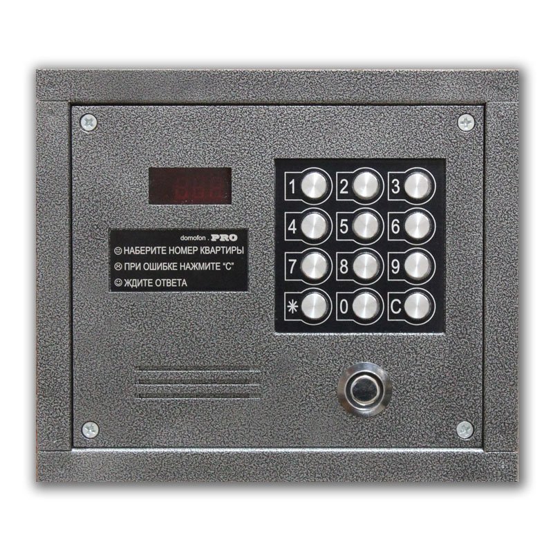 Многоабонентский аудио блок вызова с цифровой адресацией, моноблок (блок вызова + блок электроники), до 255 абонентов, считыватель Touch Memory, до 1000 ключей, защита контактора от разряда высокого напряжения, трёхразрядная индикация, кнопочная клавиатура с подсветкой, встроенная схема размагничивания электромагнитного замка, врезной, 15 В, 0,3 А, 210х180х35 мм, -30...+40°C, серебряный антик