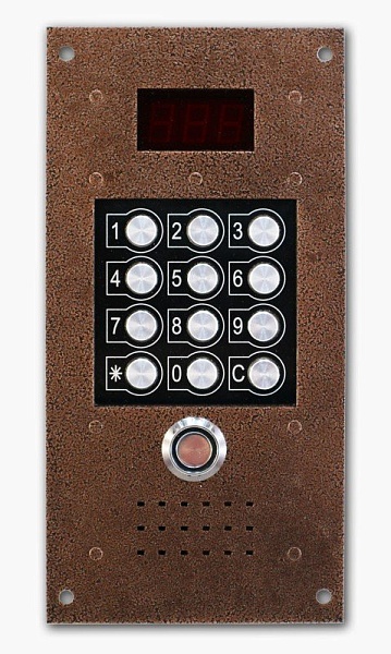 Многоабонентский аудио блок вызова с цифровой адресацией, до 255 абонентов (999 при работе с БКЗ-3А). Вводимые номера: от 1 до 999. Работа с идентификаторами DS1990A, функции *АНТИКЛОН* и *АВТОСБОР*, память ключей: 2044 (4092 или 8188 при замене микросхемы памяти). Постоянная светодиодная подсветка клавиатуры. Встроенная плата снятия остаточной намагниченности. U-пит.пост. 15 В, I-потр. 0,3 А (без учёта эл.магн. замка). t-раб. -30…+40°С, габ.размеры 220х110х32 мм. Цвет корпуса: медный антик (порошковое покрытие).