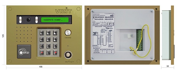 Блок вызова (серия 400), ЖКИ дисплей, т/в цвет. "Board", ИК п/свет, кн. вызова консьержа, считыватель ключей VIZIT-TM / VIZIT-RF2.1, работает совместно с БУД 420. DC 9...14 В, 0.1 А 190х150х38 мм. -20°..+45°С