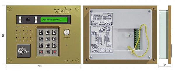 Блок вызова для совместной работы с БУД-420M. Встроенные считыватели ключей VIZIT-RF2.1, ЖК дисплей, кнопка "Консьерж", телекамера цв., 380 ТВЛ, PAL, 1,5 лк, 120°