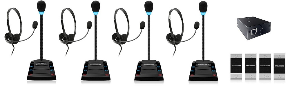 Комплект "клиент-кассир" с подключаемой гарнитурой и системой записи переговоров, 2400 часов на MicroSD карту, сенсорное управление, линейный выход, антивандальная панель, уголок, подсветка микрофона, в комплекте: 4-канальный аудиорегистратор Sprut SR-500/4 + 4 переговорных устройства STELBERRY S-400 + комплект для коммутации + блоки питания