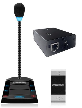 Комплект "клиент-кассир" с режимом "симплекс" и системой записи переговоров, 2400 часов на MicroSD карту, сенсорное управление, линейный выход, антивандальная панель, уголок, подсветка микрофона, в комплекте: 2-канальный аудиорегистратор Sprut SR-500/2 + 1 переговорное устройство STELBERRY S-400 + комплект для коммутации + блоки питания