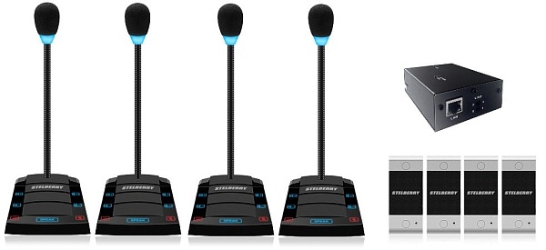 Комплект "клиент-кассир" с режимом "симплекс" и системой записи переговоров, 2400 часов на MicroSD карту, сенсорное управление, линейный выход, антивандальная панель, уголок, подсветка микрофона, в комплекте: 4-канальный аудиорегистратор Sprut SR-500/4 + 4 переговорных устройства STELBERRY S-400 + комплект для коммутации + блоки питания