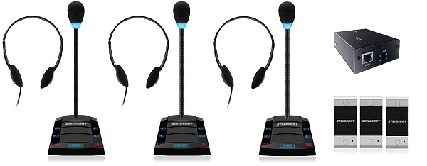 Комплект "клиент-кассир" с режимом "симплекс", наушниками и системой записи переговоров, 2400 часов на MicroSD карту, сенсорное управление, линейный выход, антивандальная панель, уголок, подсветка микрофона, в комплекте: 4-канальный аудиорегистратор Sprut SR-500/4 + 3 переговорных устройства STELBERRY S-400 + комплект для коммутации + блоки питания