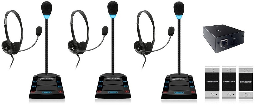 Комплект "клиент-кассир" с режимом "симплекс", гарнитурой и системой записи переговоров, 2400 часов на MicroSD карту, сенсорное управление, линейный выход, антивандальная панель, уголок, подсветка микрофона, в комплекте: 4-канальный аудиорегистратор Sprut SR-500/4 + 3 переговорных устройства STELBERRY S-400 + комплект для коммутации + блоки питания