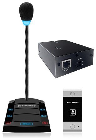 Комплект "клиент-кассир" с вызовом, режимом "симплекс" и системой записи переговоров, 2400 часов на MicroSD карту, сенсорное управление, линейный выход, антивандальная панель, уголок, подсветка микрофона, в комплекте: 2-канальный аудиорегистратор Sprut SR-500/2 + 1 переговорное устройство STELBERRY S-400 + комплект для коммутации + блоки питания