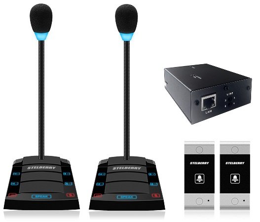 Комплект "клиент-кассир" с вызовом, режимом "симплекс" и системой записи переговоров, 2400 часов на MicroSD карту, сенсорное управление, линейный выход, антивандальная панель, уголок, подсветка микрофона, в комплекте: 2-канальный аудиорегистратор Sprut SR-500/2 + 2 переговорных устройства STELBERRY S-400 + комплект для коммутации + блоки питания