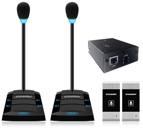 Комплект "клиент-кассир" с меткой конфликтных ситуаций и системой записи переговоров, 2400 часов на MicroSD карту, сенсорное управление, линейный выход, антивандальная панель, уголок, подсветка микрофона, в комплекте: 2-канальный аудиорегистратор Sprut SR-500/2 + 2 переговорных устройства STELBERRY S-425 + комплект для коммутации + блоки питания