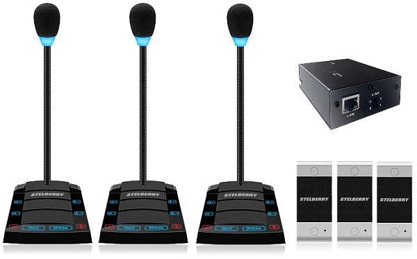 Комплект "клиент-кассир" с режимом "симплекс", функцией речевого оповещения и системой записи переговоров, 2400 часов на MicroSD карту, сенсорное управление, линейный выход, антивандальная панель, уголок, подсветка микрофона, в комплекте: 4-канальный аудиорегистратор Sprut SR-500/4 + 3 переговорных устройства STELBERRY S-400 + комплект для коммутации + блоки питания