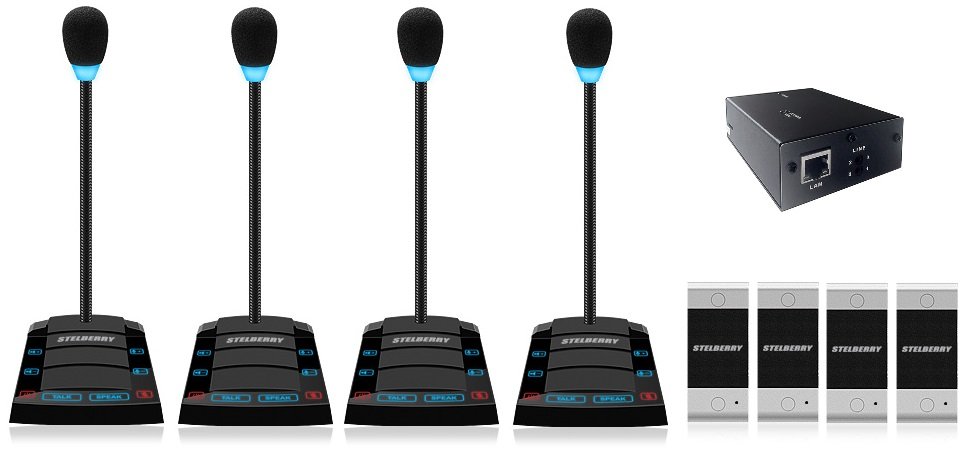 Комплект "клиент-кассир" с режимом "симплекс", функцией речевого оповещения и системой записи переговоров, 2400 часов на MicroSD карту, сенсорное управление, линейный выход, антивандальная панель, уголок, подсветка микрофона, в комплекте: 4-канальный аудиорегистратор Sprut SR-500/4 + 4 переговорных устройства STELBERRY S-400 + комплект для коммутации + блоки питания