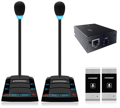 Комплект "клиент-кассир" с режимом "симплекс", вызовом, функцией речевого оповещения и системой записи переговоров, 2400 часов на MicroSD карту, сенсорное управление, линейный выход, антивандальная панель, уголок, подсветка микрофона, в комплекте: 2-канальный аудиорегистратор Sprut SR-500/2 + 2 переговорных устройства STELBERRY S-400 + комплект для коммутации + блоки питания