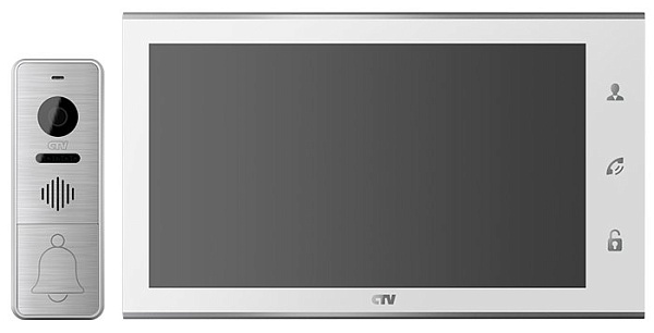 Комплект видеодомофона в одной коробке (вызывная панель CTV-D400FHD и монитор CTV-M4105AHD), поддержка формата Full HD, монитор с экраном 10", Hands free, детектор движения, панель из стекла с сенсорным управлением "Easy buttons", встроенная память, встроенный слот для micro SD (до 64ГБ), переключение стандартов 1080p/720p/960H, встроенный источник питания, подкл до 2 вызывных панелей и 4 мониторов, цвет корпуса - белый.
