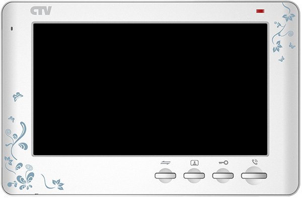 Монитор видеодомофона со сменными передними панелями (серебристый металлик, "шампань", "белый декор"), с кнопочным управлением, встроенный автоответчик, встроенный источник питания. Цвет корпуса - белый.