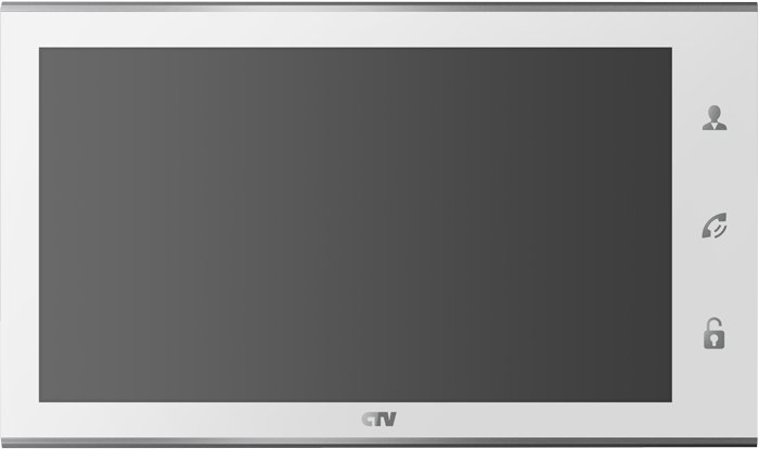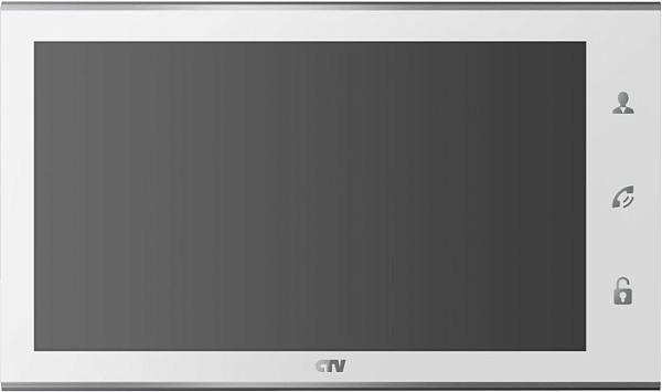 Монитор видеодомофона, стеклянная сенсорная панель управления "Easy Buttons", поддержка форматов AHD, TVI, CVI и CVBS с разрешением 1080p/720p/960H, автоответчик, режим ожидания с индикацией времени, встроенный источник питания. Цвет корпуса - белый.