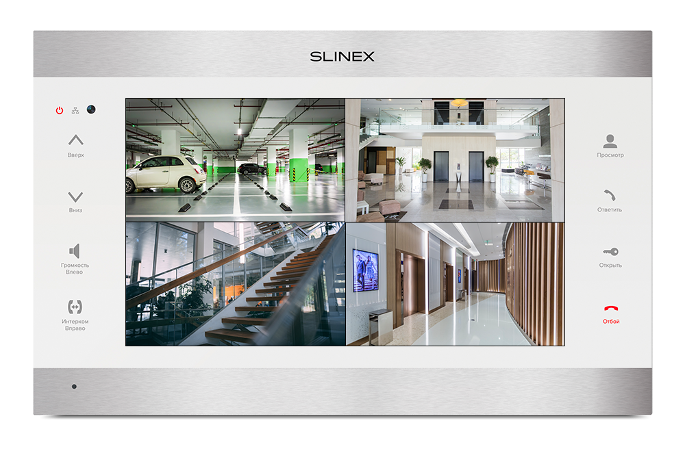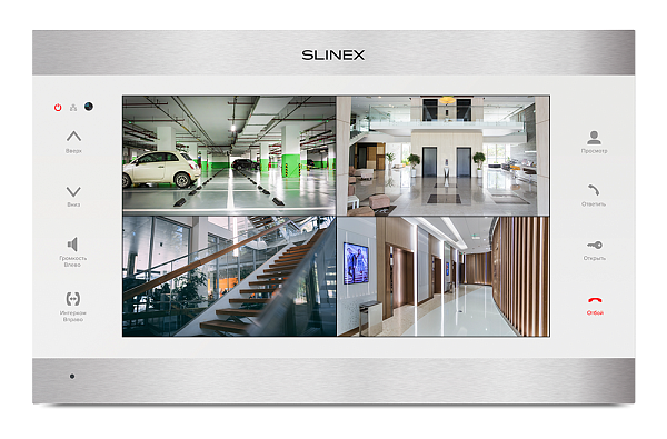 Монитор домофона цветной, 10” сенсорный IPS TFT экран 16:9, разрешение экрана 1024×600. Подключение 2-х панелей и 2-х камер форматов: AHD/TVI/CVI/CVBS (720p,1080p). Запись фото или видео на SD-карту до 256 ГБ. Интерком до 4-х домофонов: SL-10M(HD), Sonik 10, SL-07M(HD), SQ-07MT(HD), SM-07M(N), Sonik 7,SQ-04M (SL-07IP(HD) и SL-10IPT(HD) могут быть только основными при соединении в интеркоме). Поддержка мобильного приложения на Android и iOS, подключение к сети Ethernet, квадратор, функция DVR (запись по всем 4 каналам по детекции движения или по расписанию), встроенный Wi-Fi. Удаленный просмотр дополнительных камер и вызывных панелей. 16 полифонических мелодий. Режим «Не беспокоить», заставка с часами. Потребляемая мощность – до 12 Вт. Питание: ~100-240 В или +13,5 В, 305×190×24 мм. Цвет: серебро+белый.