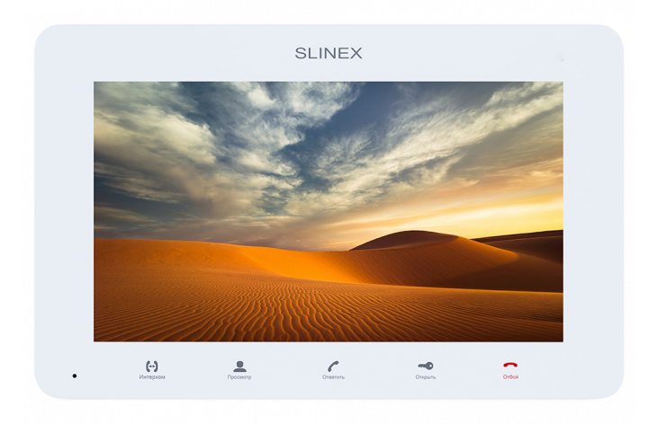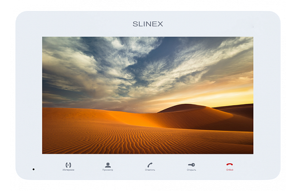 Монитор домофона цветной, 7" IPS LCD дисплей 16:9, разрешение экрана 1024×600. Подключение 2-х вызывных панелей и 2-х видеокамер. Встроенная память на 100 кадров. Поддержка microSD карт до 32 ГБ, запись фото и видео. Программная детекция движения. Интерком до 4-х домофонов: SL-10IP, SL-10IPT, SL-10M, SL-10, SL-07IP, SL-07M, SL-07, SL-07M, SQ-07MT, SQ-07, SM-07M(N), SQ-04M, MS-04, SM-04M (SL-07IP,SL-10IP и SL-10IPT могут быть только основными при соединении в интеркоме). 12 полифонических мелодий, три временных режима уровня громкости, режим «Не беспокоить». Потребляемая мощность – до 7 Вт, питание: ~100-240 В или +13,5 В. Размеры: 193×123×18 мм. Цвет - белый.
