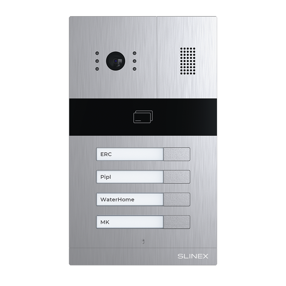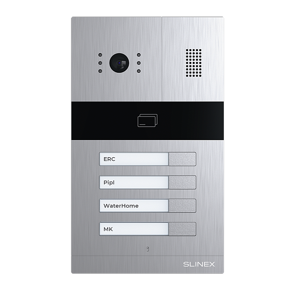 Цветная вызывная видеопанель на 4 абонента со встроенным контроллером и считывателем EM-Marin и Mifare. Матрица CMOS 1/2,9" с механическим ИК фильтром, AHD 1080p (2 Мп)/AHD 720p (1 Мп)/PAL (960 ТВЛ), угол обзора: 115°. Память: 248 идентификаторов. Выход Wiegand-26. Подсветка именных табличек абонентов, врезная установка. НО/НЗ контакт реле. Питание: 12В, 500мА, IP65, -40...+50°C. Размеры: 110х185х34 мм. Цвет: серебро.