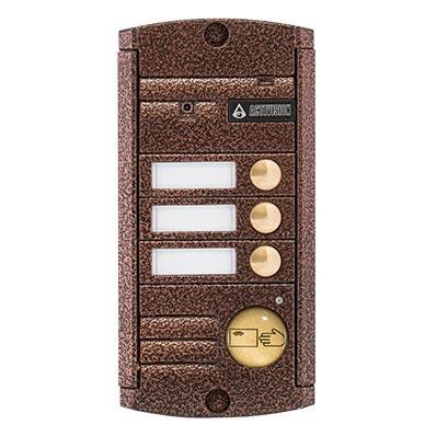 Вызывная видеопанель на 3 абонента со встроенным Proxy считывателем, накладная, 4-х проводная, 1000 ТВЛ, ИК-подсветка, память на 1005 ключей, питание 12 В, -50…+50°C, IP55, 140х70х20 мм, цвет медь