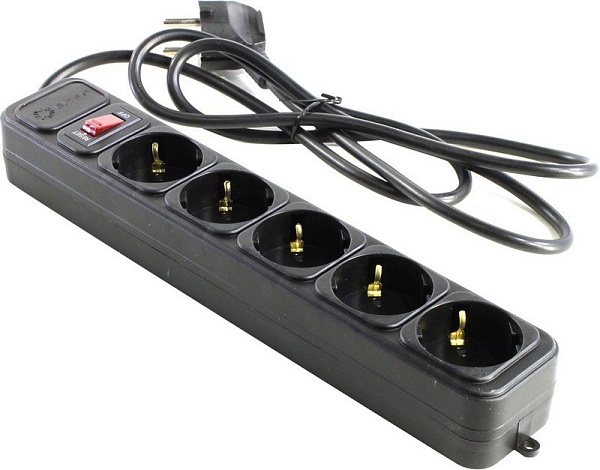 Удлинитель с выключателем 5 розеток EURO с заземлением, длина провода 1.5 м, сечение провода 3х0.75 кв.мм, максимальная нагрузка 2.2 кВт, номин. напряжение 220В, черный, 299х50х39 мм.