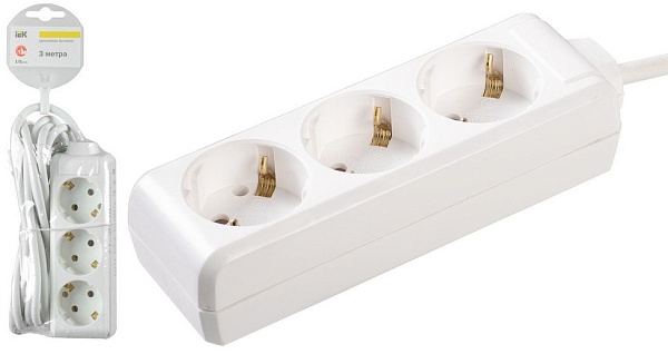 Удлинитель 3 места 2Р+РЕ, с заземлением, длина провода 3м, сечение провода 3х1.0кв.мм, P-макс.3500кВт, U-ном.250В; t-раб.+1...+35°С. Цвет белый.