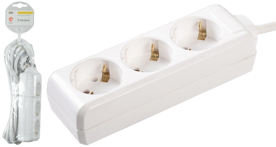 Удлинитель 3 места 2Р+РЕ, с заземлением, длина провода 5м, сечение провода 3х1.0кв.мм, P-макс.3500Вт, U-ном.250В; t-раб.+1...+35°С. Цвет белый.