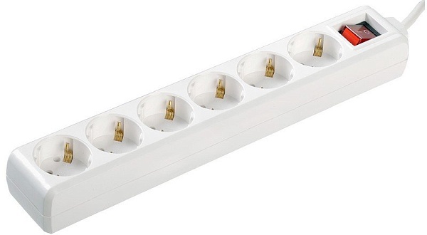 Удлинитель с выключателем 6 места 2Р+РЕ, с заземлением, длина провода 3 м, марка провода ПВС, сечение провода 3х1.0 кв.мм, максимальная нагрузка 3.5 кВт, напряжение 250В, белый