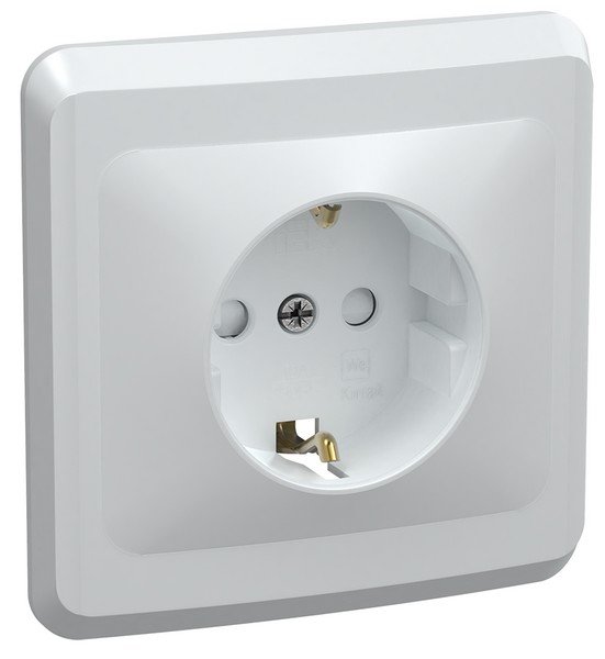 Розетка 1-местная с заземляющим контактом с защитной шторкой ВЕГА; U-ном.250В, I-ном.16А; IP20, t-раб.-25...+40°С, 81х80.5х45мм. Белого цвета.
