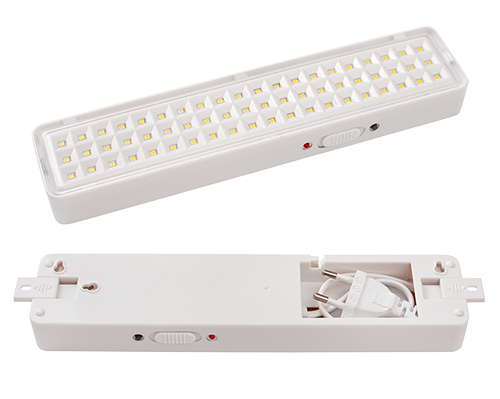Светильник аварийного освещения светодиодный непостоянного действия; 60 SMD светодиодов, мощность источника света 3 Вт, световой поток 200 Лм; U-пит.187...242В, P-потр.1 Вт, встроенный Li-ion АКБ 3.7В, емкостью 2000 мАч, защита аккумулятора от глубокого разряда и перезаряда, время свечения - до 6 часов; t-раб.0...+40°С, 250х57х27мм , 0.2кг