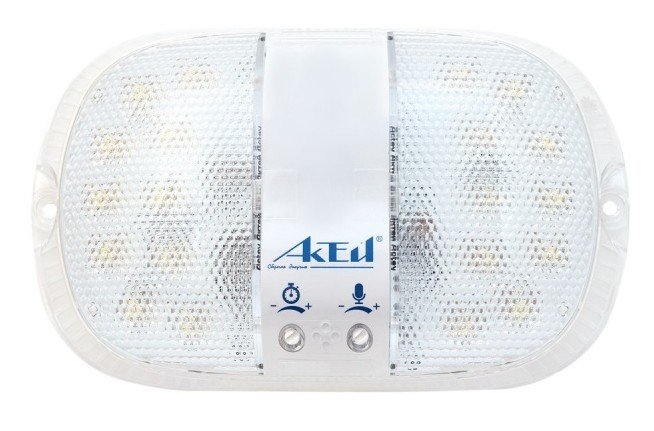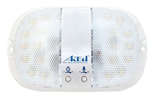 Светильник светодиодный энергосберегающий многорежимный с датчиком освещённости, акустическим датчиком и функцией перезапуска таймера, антивандальный; U-раб. 175…265 В, Р-потр.деж. 2 Вт, Р-потр.раб. 8 Вт; свет.поток 800 лм, регулировки акуст.чувствительности и времени свечения, IP30, t-раб. -30...+40°С, габ.размеры 182х110х42 мм.