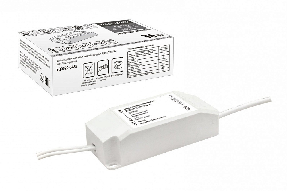 Драйвер для ЛП 02 595х595 (блок питания для светодиодной панели), мощность 36 Вт, входное напряжение 180...265 В, IP20, t-раб.–20...+40°C, габ.размеры 94х23х40 мм