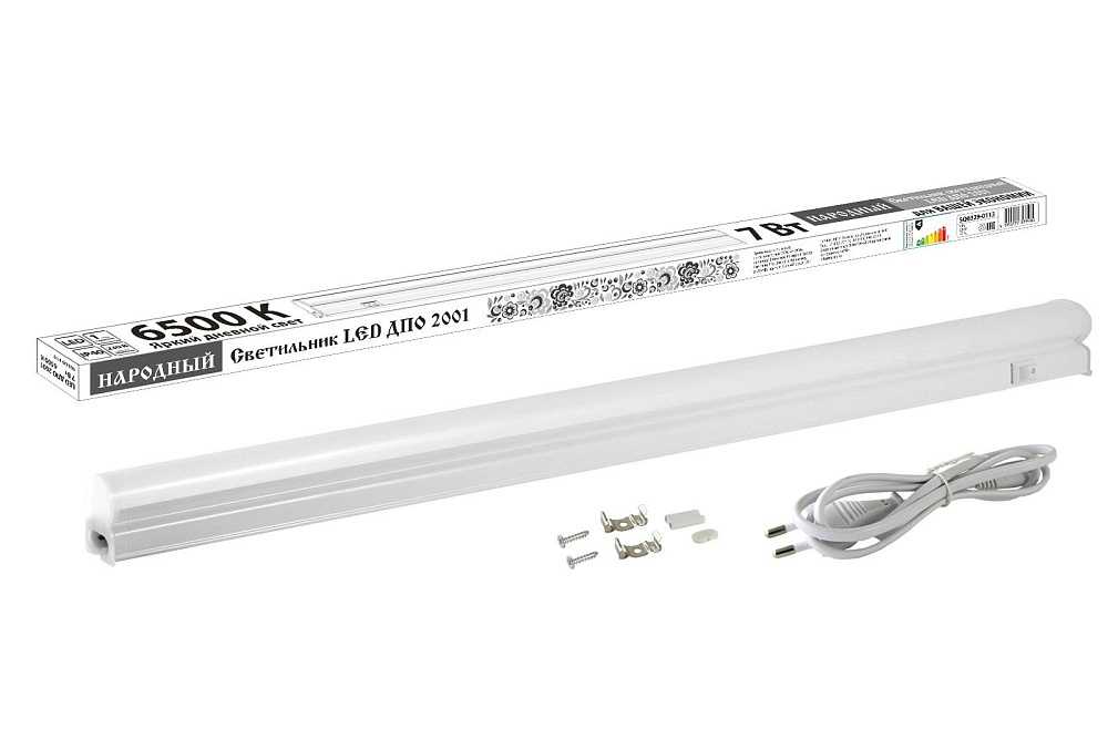 Светильник накладной линейный светодиодный, мощность 7 Вт, световой поток 560 Лм, цветовая температура 6500 K, U-вх. 180...265 В, IP40, t-раб.–10...+40°C, габ.размеры 568×22×34 мм.