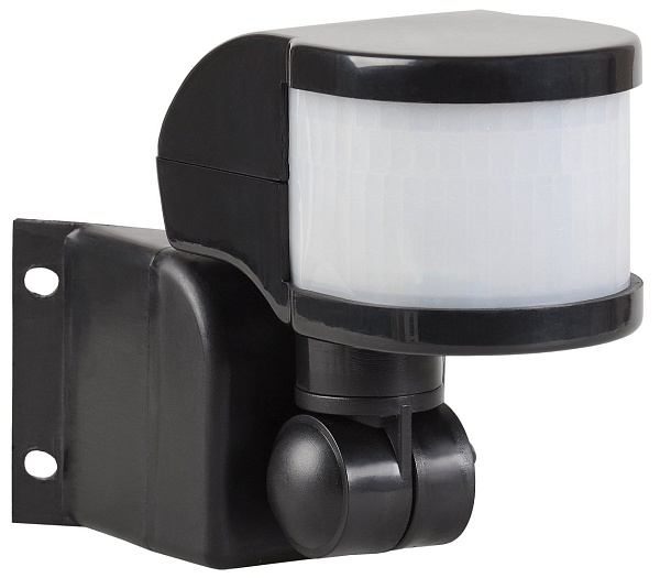 Датчик движения для управления нагрузкой, рабочее напряжение 220 В, коммутируемая нагрузка 1100 Вт (max), дальность действия 12 м, угол обзора 270°, степень защиты оболочкой IP44, черный, угловой
