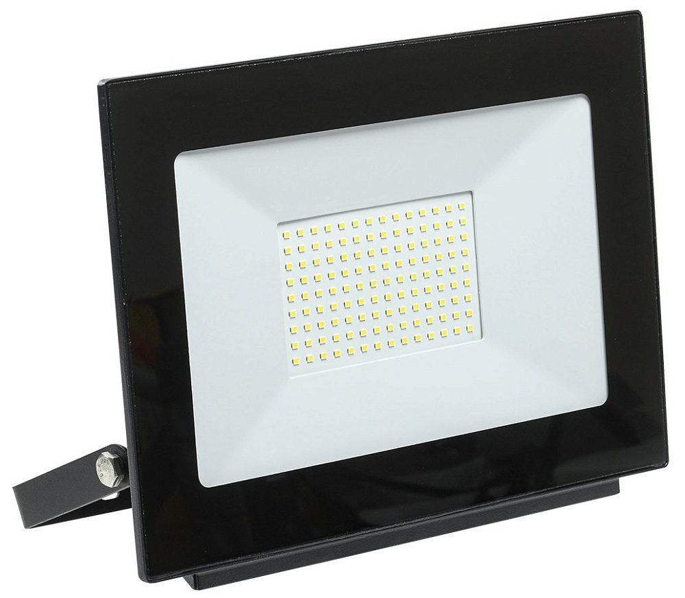 Прожектор светодиодный 100 Вт, световой поток 8000 лм; цветовая температура 6500 К; угол светового пучка 110°, U-пит. 200…240 В/50 Гц, IP65, t-раб. -40…+50°С, габ.размеры 327х40х250 мм, алюминиевый корпус, черный.