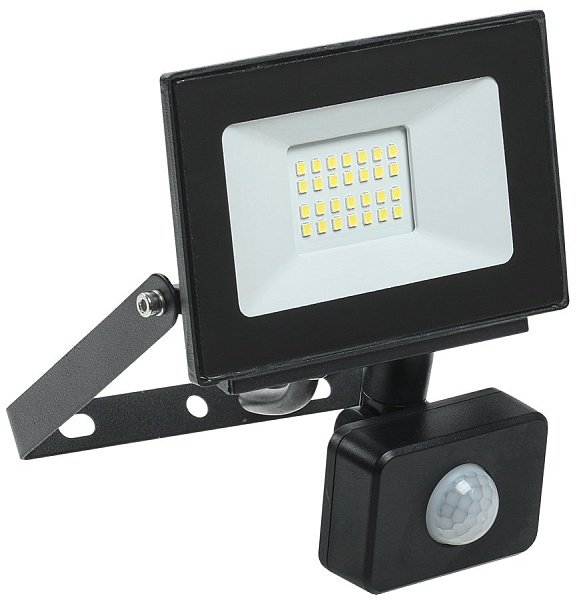Прожектор светодиодный с датчиком движения 20 Вт, световой поток 1600 лм, цветовая температура 6500 К, угол светового пучка 110°; тип датчика инфракрасный, 180°, дальность 6 м; U-пит. 200…240 В/50 Гц, Р-потр. 0.5Вт; IP54, t-раб. -40…+50°С, габ.размеры 134х45х168 мм, алюминиевый корпус, черный.