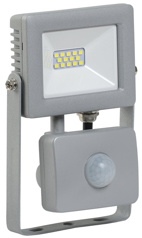 Прожектор светодиодный с датчиком движения 10 Вт, световой поток 800 лм; цветовая температура 6500 К; угол светового пучка 120°; тип датчика инфракрасный, 120°, дальность 6 м, U-пит. 180…240 В/50(60) Гц, IP44, t-раб. -45…+50°С, габ.размеры 90х150х54 мм, алюминиевый корпус, серый.