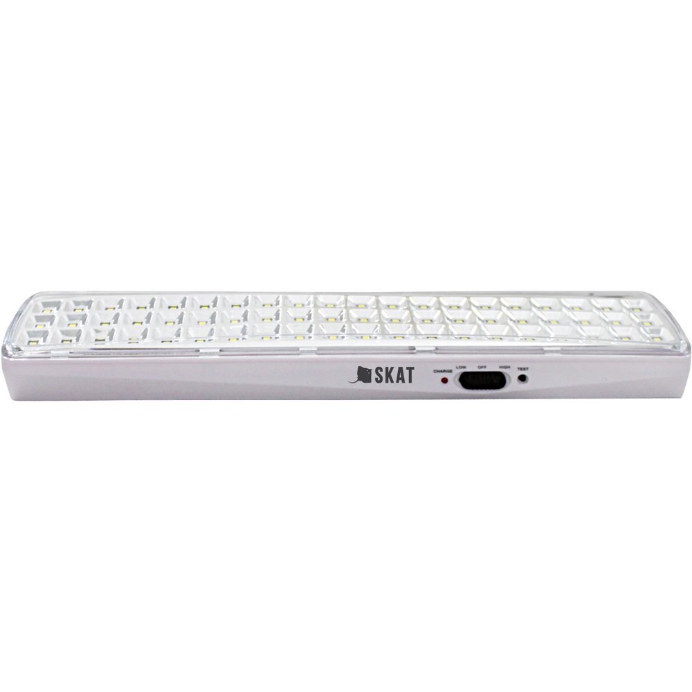 Светильник аварийного освещения; 60 светодиодов, 60х2500мКд; U-пит.110...240В, Li-Ion АКБ 3.6В 2400 мАч, 2 режима работы; время резерва до 3/6 часов; поворотные кронштейны для потолочного крепления, 2 варианта настенного крепления; защита АКБ от перезаряда и глубокого разряда; IP20, t-раб.+5...+40°С, 362х65х36мм