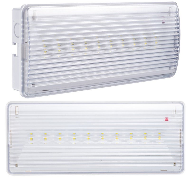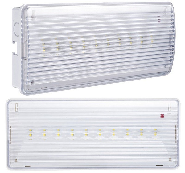 Светильник аварийного освещения светодиодный постоянного/непостоянного действия; 10 SMD светодиодов, световой поток 150 Лм, цвет.температура 6500 К; U-пит.187...242В, P-потр. 3 Вт, встроенный Li-ion АКБ 3.7В (тип 18650), емкостью 1200 мАч, защита аккумулятора от глубокого разряда и перезаряда, время свечения - до 3 часов; IP54, t-раб.0...+40°С, габ.размеры 257х104х37 мм , 0.32 кг