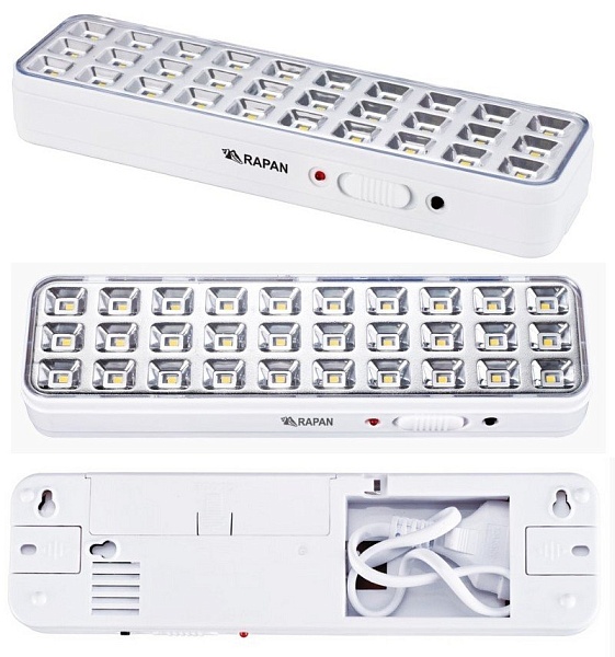 Лампа аварийного освещения 30 светодиодов, Li-Ion АКБ ёмкостью 1200 мАч; 2 режима работы; время резерва до 4/7 часа; 2 варианта настенного крепления, потолочное крепление; защита АКБ от перезаряда и глубокого разряда; яркие светодиоды