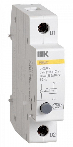 Модульный автоматический расцепитель мин./макс. напряжения РММ47 для авт. выключателей серии ВА47-29(-100), на DIN-рейку; U-ном. 230В, U-мин.165±10В, U-макс. 265±10В; время сраб. при U-мин. 0,2-0,5 с; время сраб. при U-макс. 0,05-0,15 с; IP20, t-раб. -40...+50°C