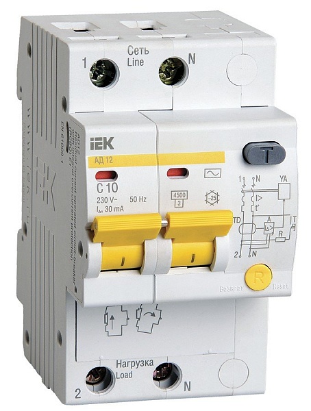 Модульный автом.выключатель дифференциального тока с защитой от перегрузки и КЗ на DIN-рейку, 2-полюсный, I-диф. 30 мА, тип тока утечки - переменный (AC), I-ном. 10 А, характер.срабатывания С, U-раб. 230 В; индикатор вкл/откл; IP20, t-раб. -25 + 40°C. Ширина 3-DIN