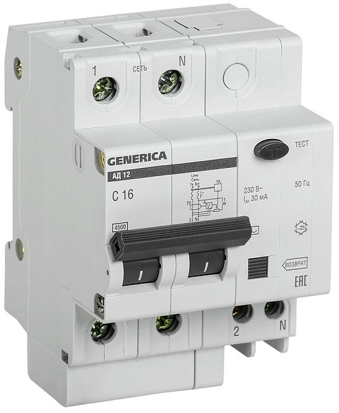 Модульный автом.выключатель дифференциального тока с защитой от перегрузки и КЗ на DIN-рейку, 2-полюсный, I-диф. 30 мА, тип тока утечки - переменный (AC), I-ном. 16 А, характер.срабатывания С, U-раб. 230 В; индикатор вкл/откл; IP20, t-раб. -25 + 40°C. Ширина 3,4-DIN
