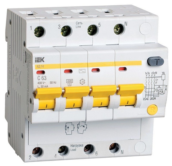 Модульный автоматический выключатель дифференциального ток на DIN-рейку, 4-полюсный, дифференциальный ток 30 мА, номинальный ток 63 А, тип срабатывания по дифференциальному току AC, степень защиты IP20, независимый индикатор положения контактов, рабочая температура -25 + 40°C