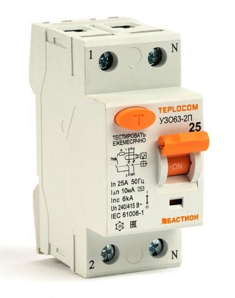 Устройство защитного отключения (УЗО), 2-полюсный; под винт 1.5...25 кв.мм; U-ном.240 В, I-ном.25 А; отключающая способность 6 кА; номинальный отключающий дифференциальный ток 10 мА; IP20, t-раб.-25…+40°С; 35х85х78 мм