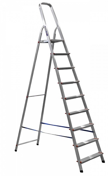 Количество ступеней 9, высота площадки 1,87 м, высота с поручнем 2.67 м, рабочая высота 3.9 м, ширина основания 0,56 м, вес 7.5 кг.