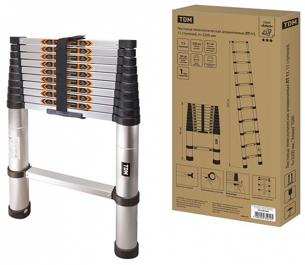 Лестница телескопическая алюминиевая, 11 ступеней, h-слож. 810 мм, h-разлож.-3200 мм, max нагрузка 130 кг, вес 9.5 кг