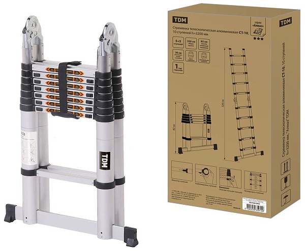 Стремянка телескопическая алюминиевая, 10 ступеней, h-слож. 820 мм, h-разлож.-3200 мм, max нагрузка 130 кг, вес 12.5 кг