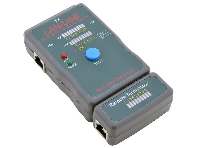 Кабельный-тестер для витой пары, коаксиала, телефона, USB кабеля, проверка целостности экрана, определение короткого замыкания в кабеле. 1 батарейка 9В "Крона" (входит в комплект поставки). Чехол в комплекте.