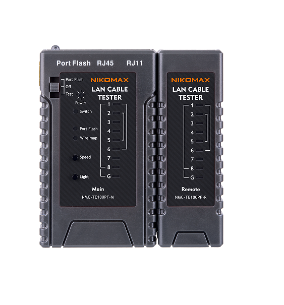 Кабельный тестер NIKOMAX, UTP/STP, RJ45, RJ12, RJ11, с функцией PortFlash и LED фонарём; KRONE 9В; 175х115х37 мм.